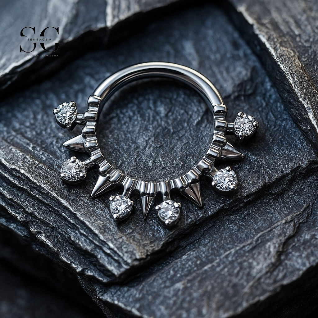 SG3216 is a bold and distinctive tri-prong round zircon nose ring, meticulously crafted from ASTM F136 titanium. Featuring a sharp, cone-like design with a secure three-prong setting, this nose ring offers a sleek, modern look, ideal for anyone looking to make a statement. Available in both titanium and gold finishes, it is customizable to suit various styles, making it a versatile piece for nose piercing on a man or anyone seeking an edgy aesthetic.