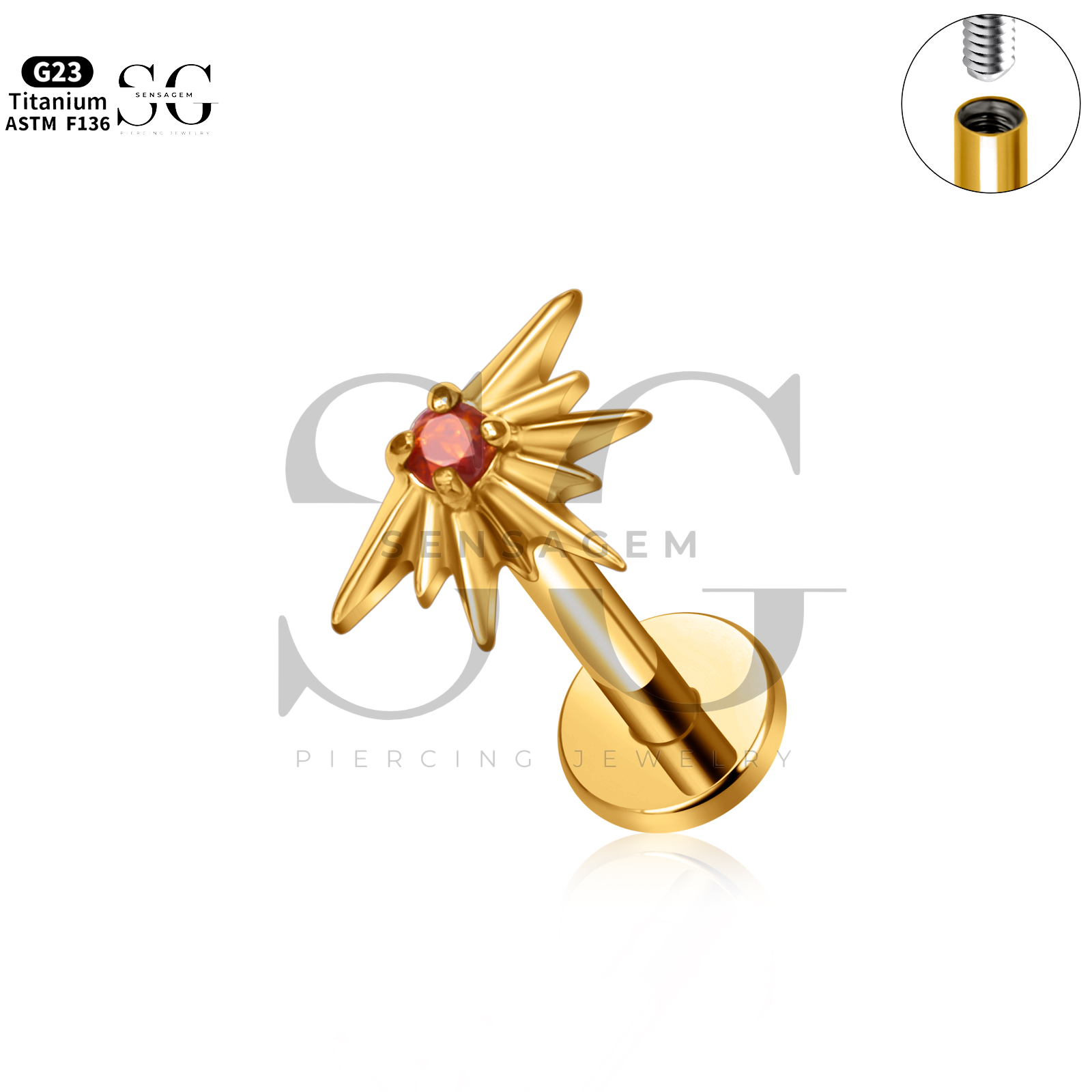 Make a bold statement with the Sensagem SG4372 Internally Threaded Labret, featuring a striking sunburst or starburst design. The captivating top showcases a vibrant red central gemstone surrounded by sharp, radiating spikes for a dynamic and eye-catching look.