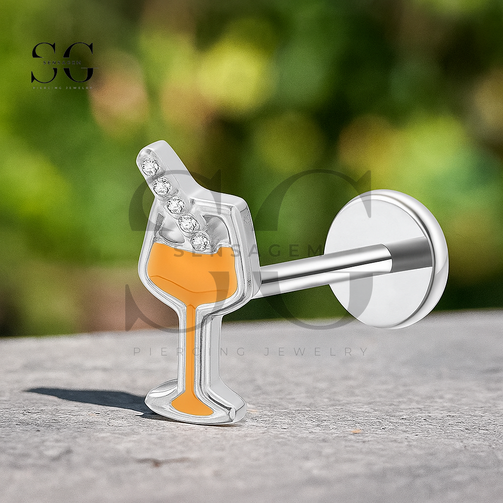 With five available post lengths (from 5mm to 12mm), this cocktail glass labret is versatile for various piercings, including the helix, koncha, tragus, and lip. Choose between the polished Tytan (Srebrny) finish or the luxurious Złoto finish to complete this unique, novelty design.