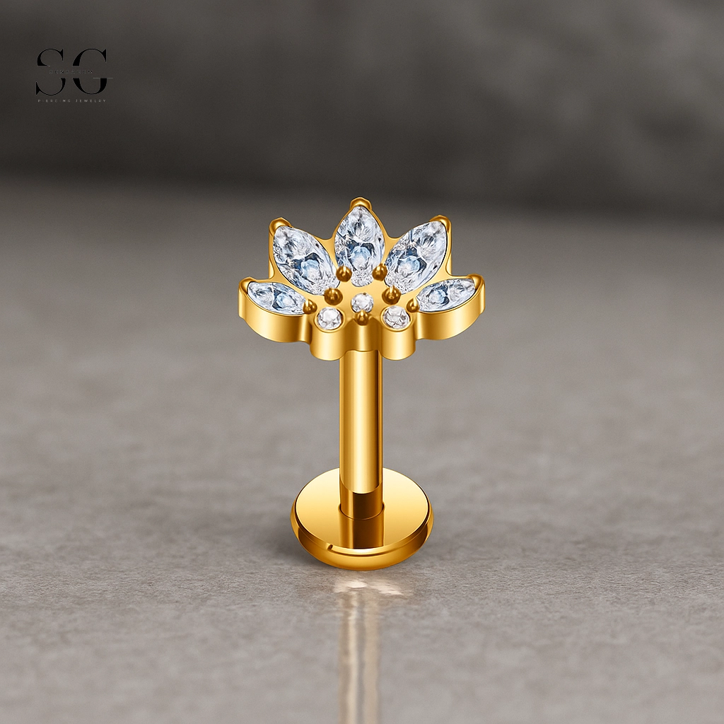 Adorn your piercing with the serene beauty of the Sensagem SG4330 Internally Threaded Lotus Zircon Labret. This exquisite piece features a meticulously crafted lotus flower design, blossoming with multiple brilliant white zircons that capture light beautifully. Its elegant and symbolic aesthetic makes it a perfect choice for lip, earlobe, helix, conch, or tragus piercings, adding a touch of sophisticated sparkle to any look.