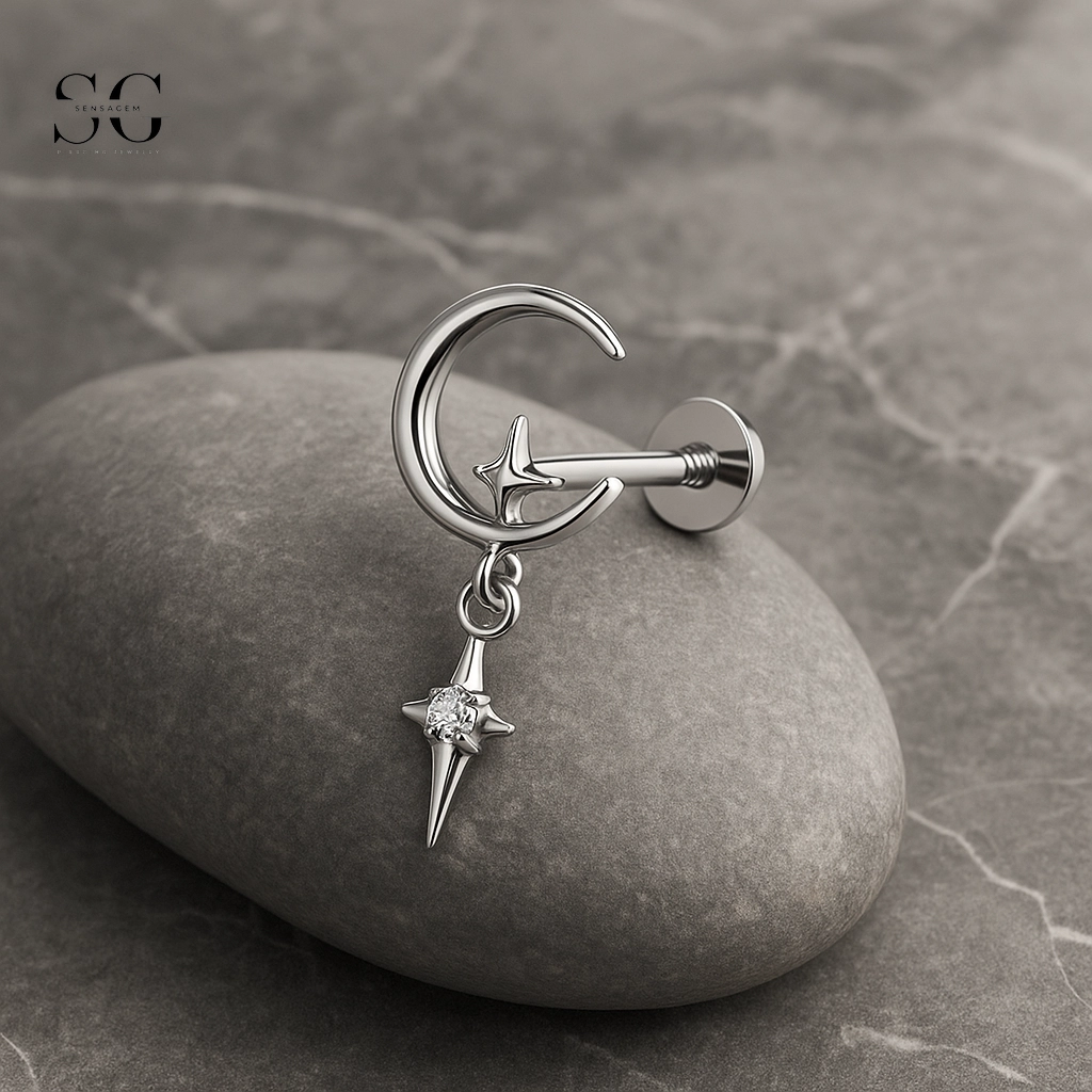 Illuminate your style with the celestial charm of the Sensagem SG4331 Internally Threaded Moon & Star Dangle Labret. This enchanting piece features a beautifully crafted crescent moon top, from which a sparkling four-point star, adorned with brilliant white zircons, gracefully dangles. It’s an ideal choice for adding a unique, whimsical touch to your earlobe, helix, conch, tragus, or even certain lip piercings.