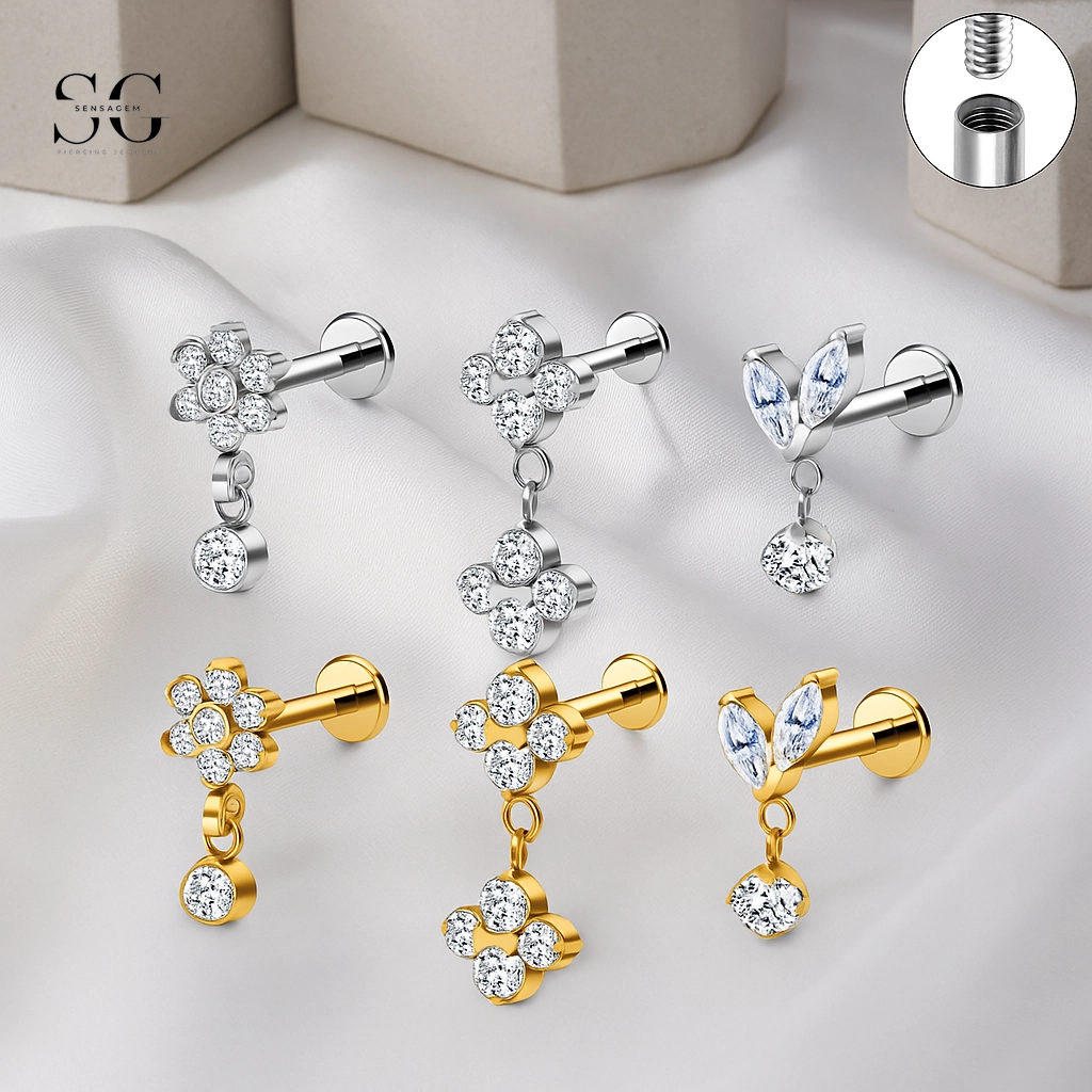 Elevate your piercing aesthetic with the versatile Sensagem SG4342 series of G23 Titanium Internally Threaded Labrets, featuring three distinct and captivating dangle designs. Each piece in this collection is crafted to add a unique touch of elegance and movement to your piercing, making them ideal for earlobe, helix, conch, tragus, or lip piercings.