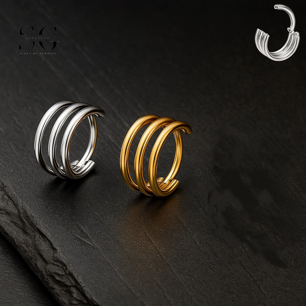 SG3218 is a minimalist yet stylish triple-ring nose ring, crafted from premium ASTM F136 titanium for durability and comfort. This sleek design features three interconnected rings, offering a bold look without the addition of gemstones, perfect for men nose piercing styles that demand a modern, clean aesthetic. Available in titanium, gold, and black finishes, this nose ring can be customized to match your preferences, making it a versatile choice for any piercing collection.